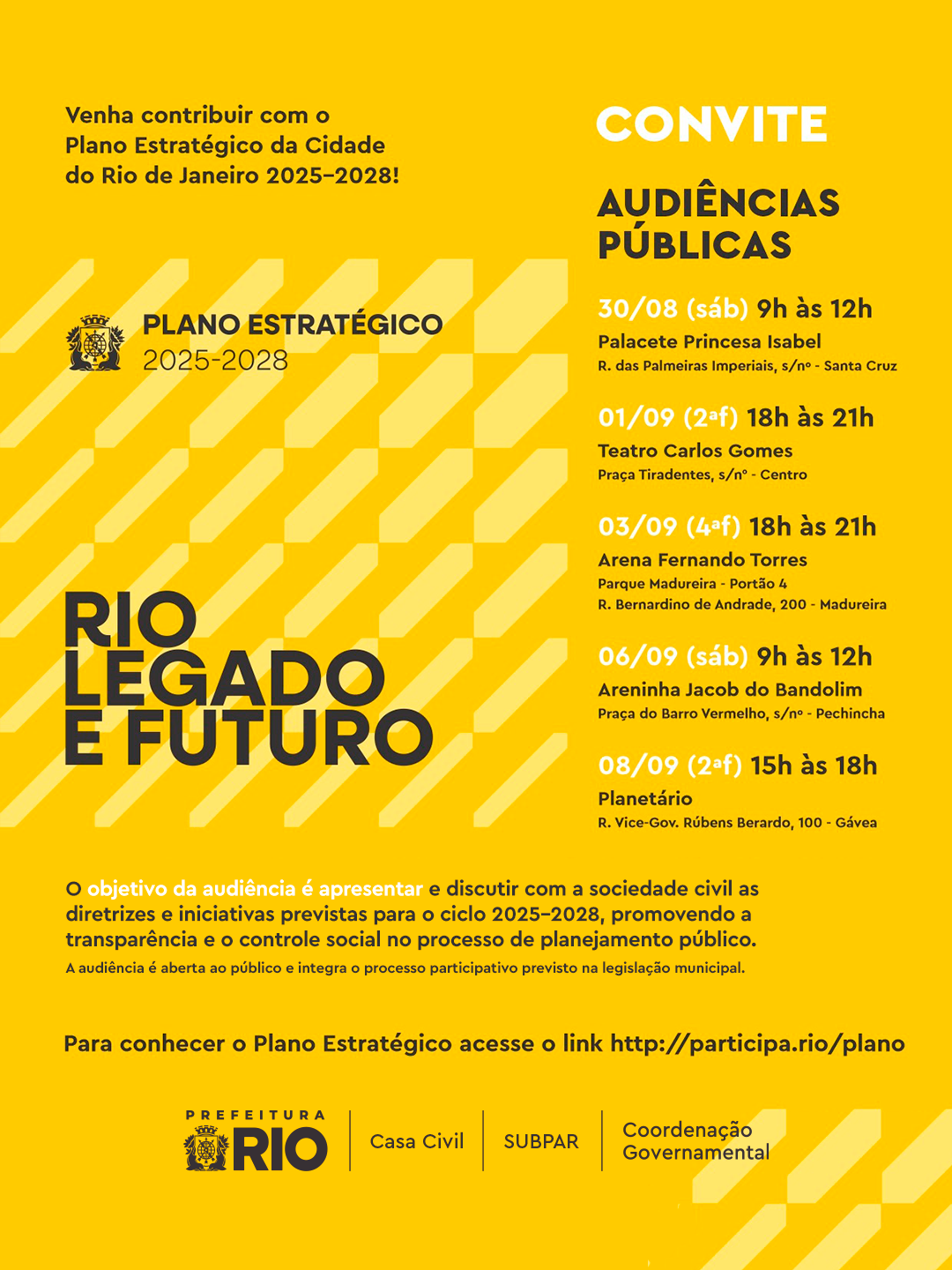 AVISO DE AUDIÊNCIA PÚBLICA A Prefeitura da Cidade do Rio de Janeiro convida a sociedade civil para participar da Audiência Pública de divulgação e debate do Planejamento Estratégico da Cidade do Rio de Janeiro – 2025–2028. Data: 30/08/2025 (sábado) Horário: das 09h às 12h Local: Palacete de Santa Isabel – Rua das Palmeiras Imperiais, s/n° […]